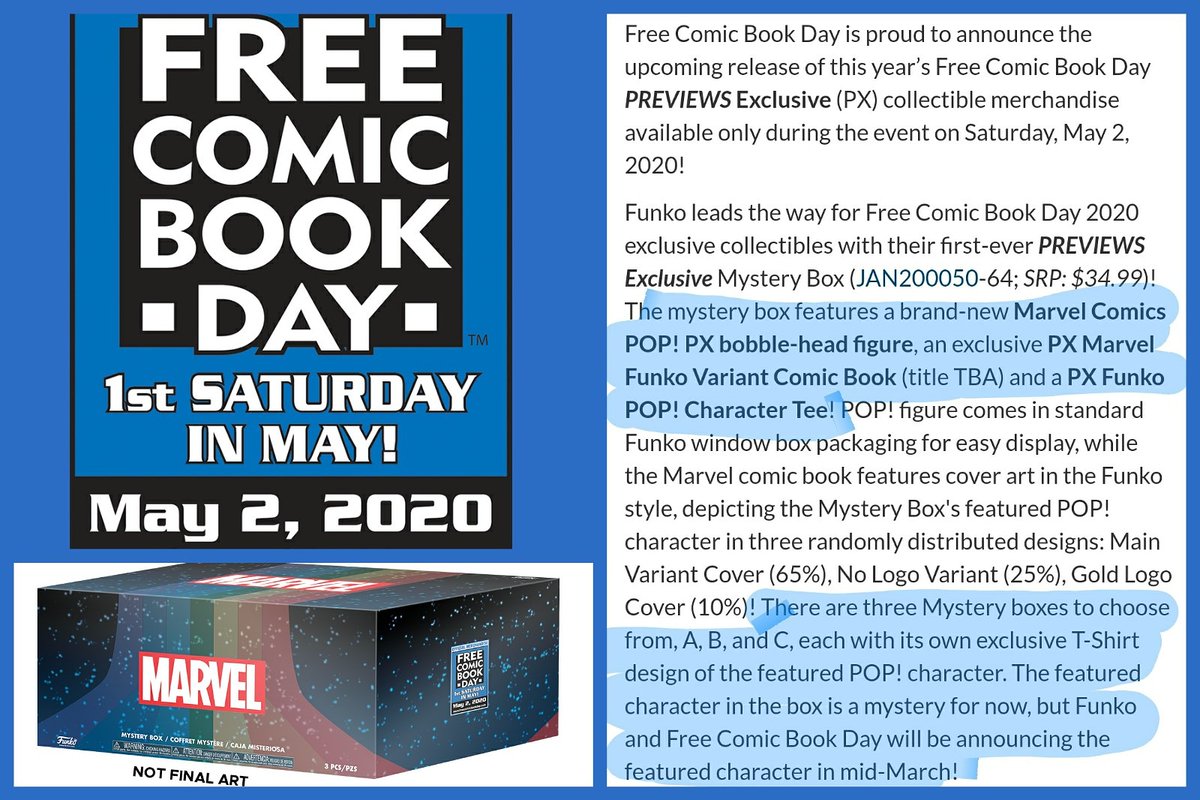 Funko leads the way for Free Comic Book Day 2020 exclusive collectibles with their first-ever PREVIEWS Exclusive Mystery Box. Inside youll find a brand-new Marvel Comics POP. Baltimore MD December 18 2019 Free Comic Book Day is proud to announce the upcoming release of this years Free Comic Book Day PREVIEWS Exclusive PX collectible merchandise available only during the event on Saturday May 2 2020.