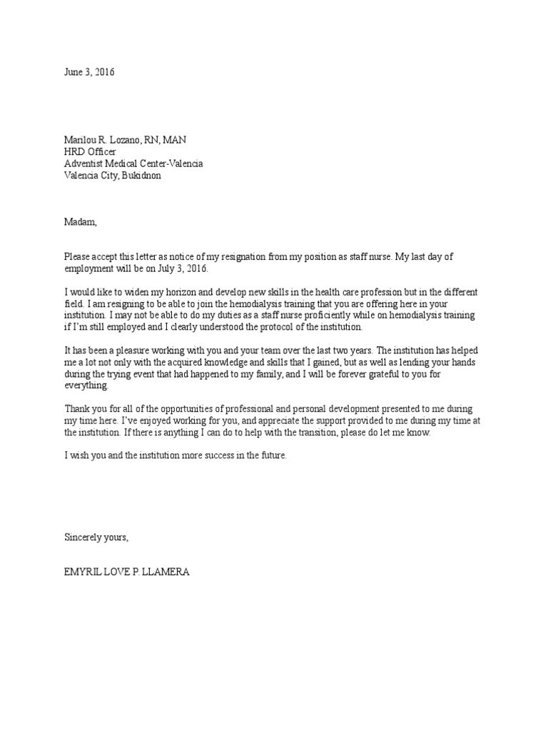 A resignation letter is a written notice letting the hospital administrators know about your plans to leave your current position. A nurse resignation letter is a way to notify your employers that youre going to retire. I look forward to using the patient care skills I learned in this position.